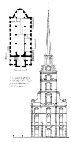 Чертёж западного фасада и план первого этажа Петропавловской церкви по состоянию на 1990-е годы, выполненный Виктором Маровым. Источник: Маров В.Ф. "Ярославль. Архитектура и градостроительство"