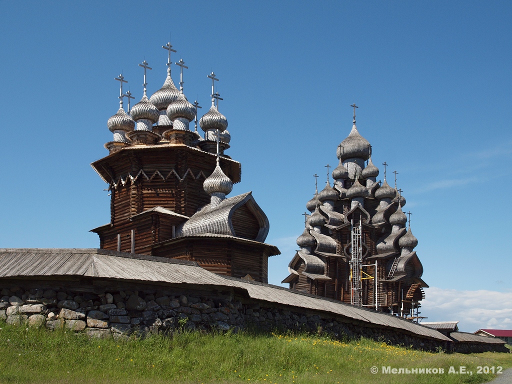 Летняя деревянная церковь Кижского Погоста. Поставлена в 1714. В 1818 обшита тесом, в 1869-1870 главки обиты железом. Уникальный по композиции 22-главый храм, один из выдающихся памятников русского зодчества. Основной объём представляет собой восьмерик, грани которого завершены бочками, увенчанный двумя убывающими по ширине малыми восьмериками, нижний из которых несет еще четыре главки, а верхний служит постаментом для центральной главы. Со четырех сторон к основному восьмерику примыкают двухступенчатые прирубы, крытые бочками, с западной стороны церковь охвачена трапезной с крыльцом на два всхода. Отдельно стоящая шатровая колокольня построена в 1862 (в 1874 перестроена). Закрыта в 1937. При реставрации в 1949-1959 снята тесовая обшивка, восстановлено лемеховое покрытие глав. В 1980 в связи со сложным техническим состоянием церкви внутри установлен металлический каркас. В 2009 начата реставрация церкви путем постепенной переборки сруба.